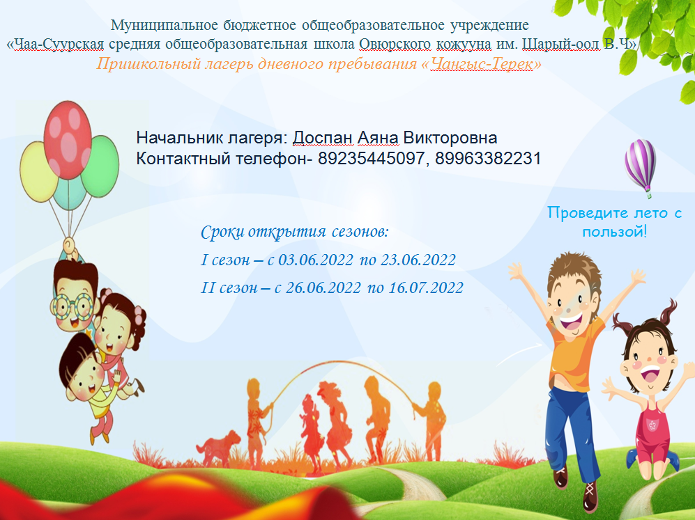 ЛОК «Чангыс-Терек» Пост.-Главсанврача-от-24.12.2020-№44-1Скачать Пост.-Главсаврача-от-24.03.2021-№10Скачать ФЗ-327-Мед.оборудование-в-лагереСкачать СанПин-№44-помещений.Медкабинет.Скачать 7 шагов к летуСкачать #Деньсемьи фотоколлаж Летняя оздоровительная компания «Чангыс-Терек» Начальник лагеря: Тюлюш Долгар-Сурэн Чузуруновна, тел. 89236990777 Сроки открытия сезонов: I сезон — с 01.06.2024 по 21.06.2024 II сезон — с 24.06.2024 по 14.07.2024