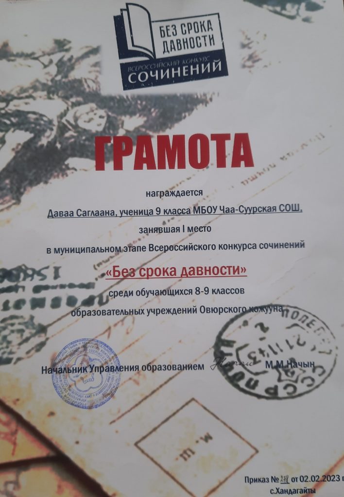 Подведены итоги Всероссийского конкурса сочинений «Без срока давности» в муниципальном этапе среди обучающихся образовательных учреждений Овюрского кожууна. Конкурс посвящен сохранению исторической памяти о жертвах военных преступлений нацистов и их пособников в годы ВОВ (1941-1945г).