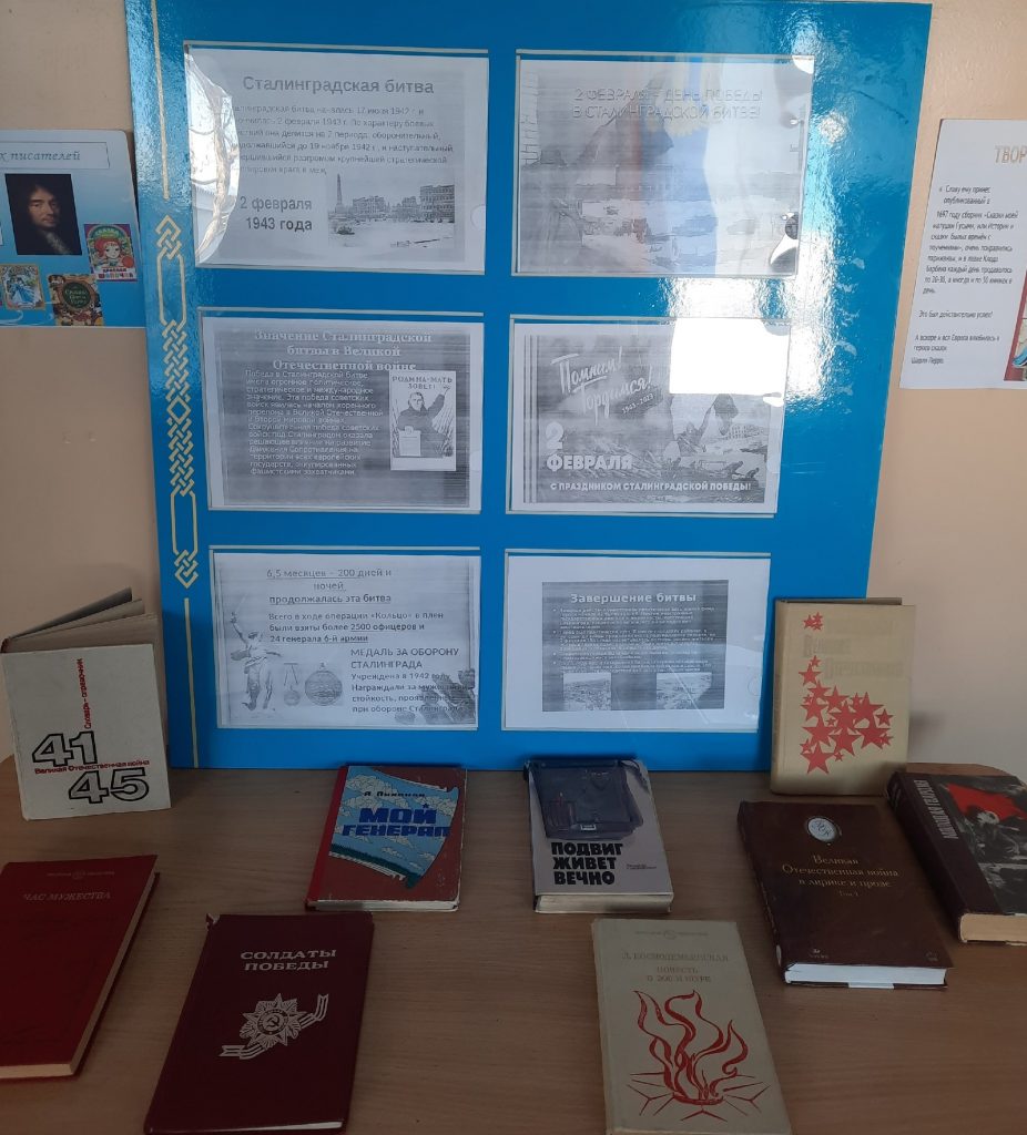 В библиотеке школы оформлена выставка-просмотр » Сталинград. 200 дней мужества и стойкости. Для читателей библиотеки подготовлен информационный буклет «Двести дней и ночей Сталинграда» и мультимедийная презентация «Волгоград».